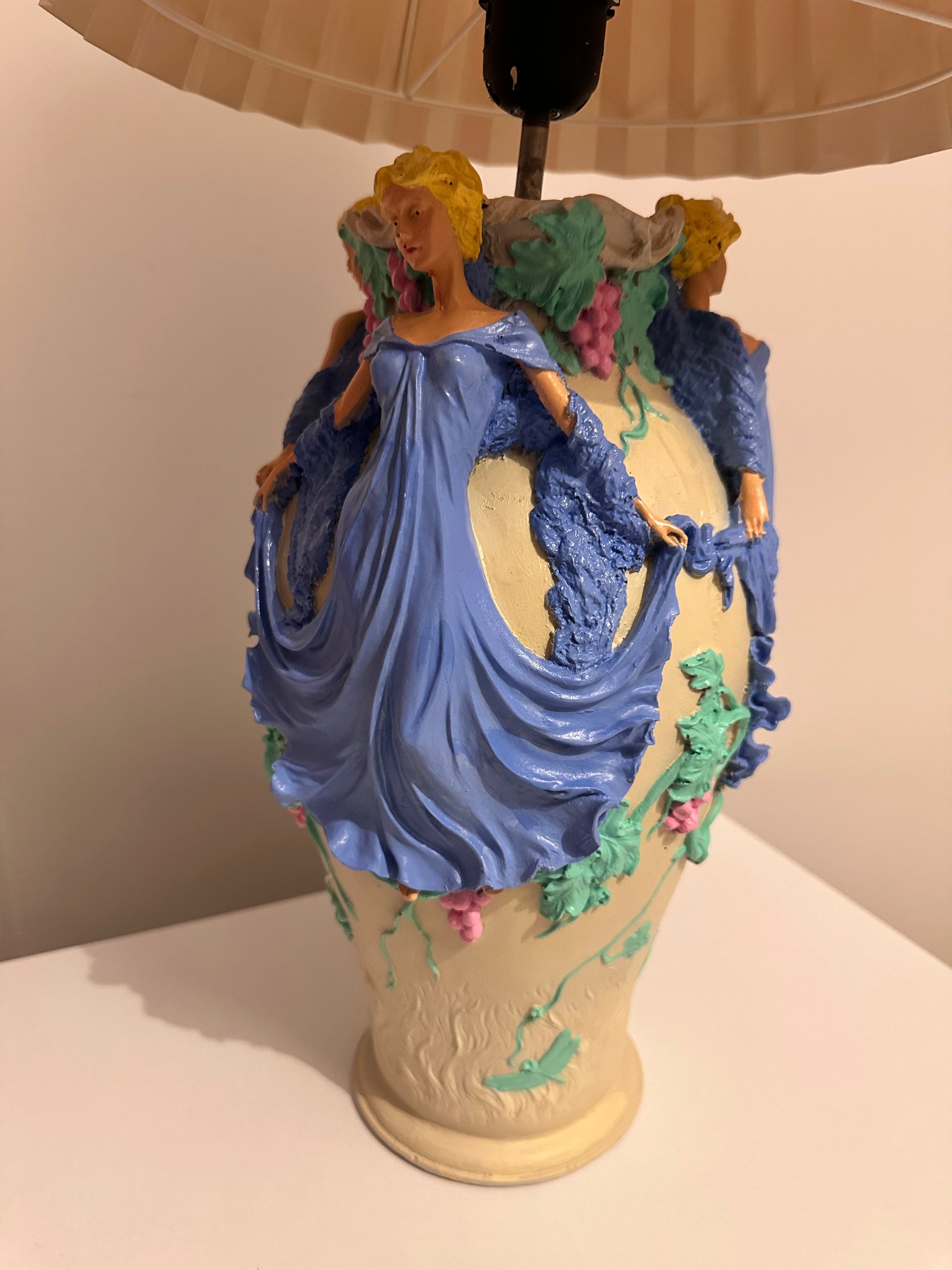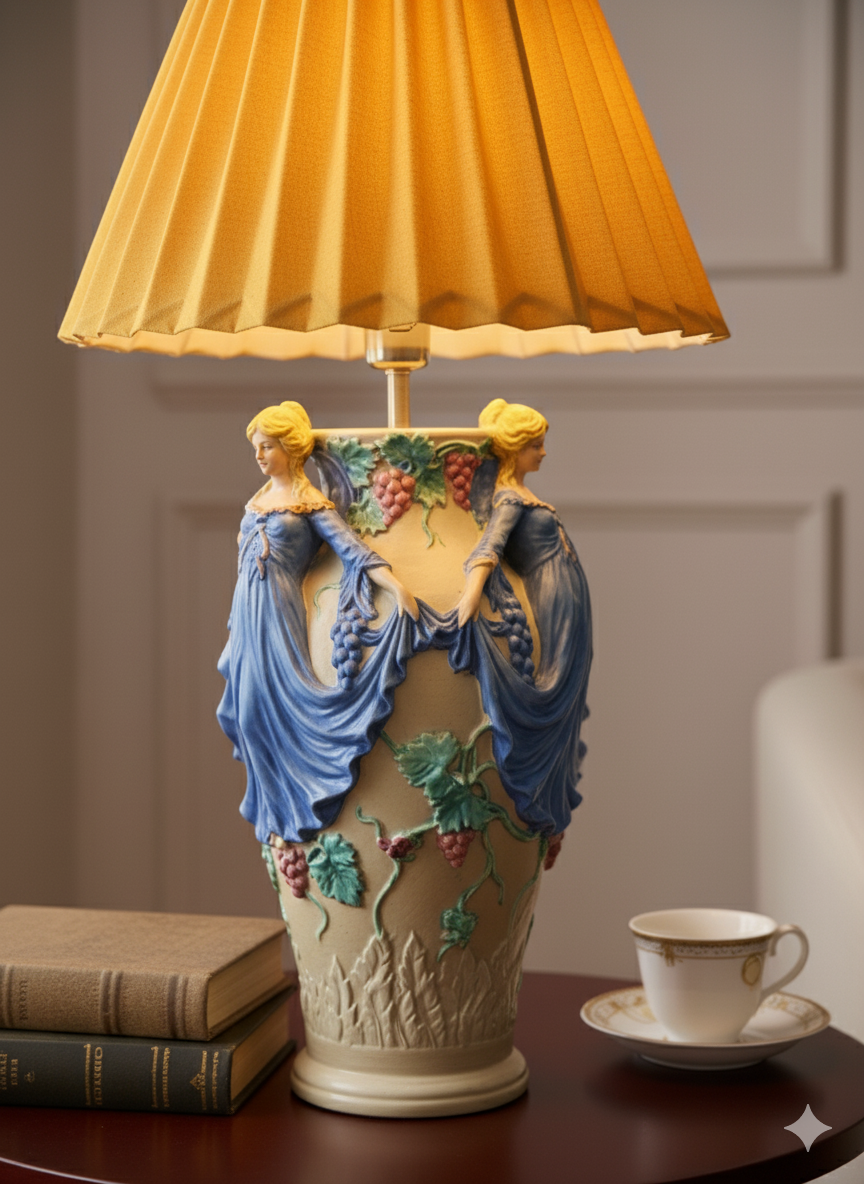 Bu şık masa lambası, sanatsal dokusu ve kabartma kadın figürleriyle klasik bir tabloyu andırıyor. Alt kısmındaki heykelsi detaylar, ışığın yumuşak tınısıyla birleştiğinde büyüleyici bir atmosfer yaratıyor.